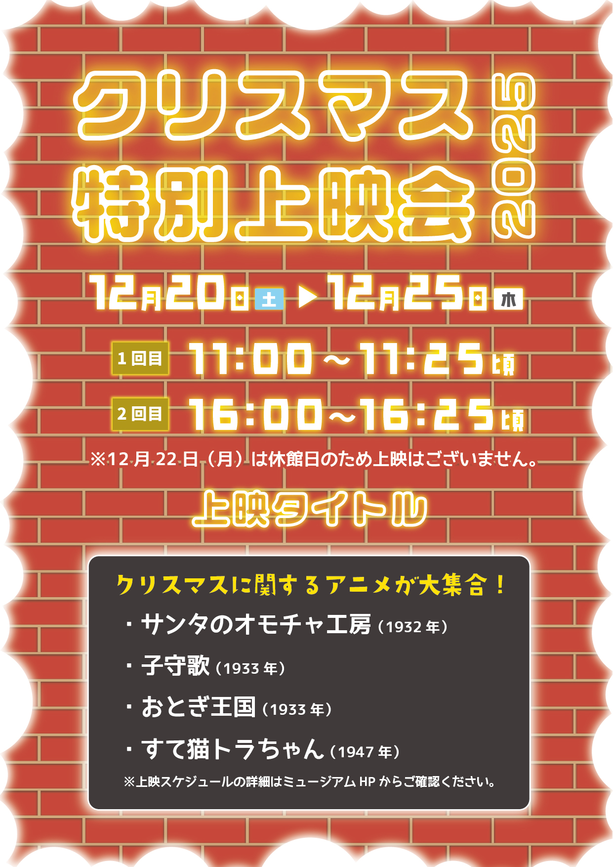 ミュージアム所蔵のクラシックアーカイブからクリスマスにまつわるアニメの上映会を開催します。